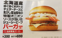 仮名『北海道産ほくほくポテトとチェダーチーズに焦がし醤油風味の特製オニオンソースが効いたジューシービーフバーガー』の『名前募集バーガー』。